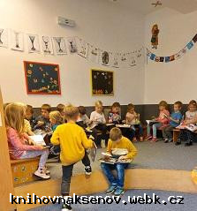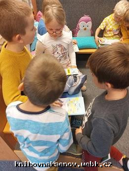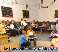 První třída - družinka ZŠ nám. Míru. Jsme poprvé v knihovně jako školáci. Čteme si pohádku, povídáme o tom, jak pohádky vznikají, jaké postavy v pohádkách vystupují a seznamujeme se s novými dětskými knížkami.