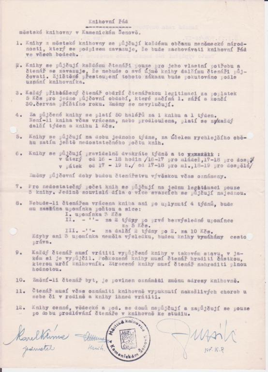 K 1. 2. 1946 čítal fond knihovny 1.158 knih (872 beletrie, 55 dětských a 231 naučných). Za rok nato už měla knihovna o 500 titulů víc. O knihovnu byl veliký zájem a čtenářů přibývalo. Koncem roku 1948 již knihovna disponovala více jak 3.000 svazky, byly objednány moderní kovové stojany a založen knižní lístkový katalog.